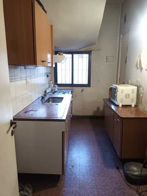 La cocina cuenta con muebles bajo y sobre mesada, además de piso de granito, y se conecta con un lavadero cubierto y un patio chico.